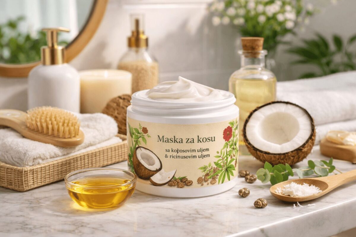 - Kokosovo ulje + ricinus: Kokosovo ulje lako prodire u dlaku i dubinski je hidrira, dok ricinus štiti površinu. Uobičajen odnos je 1 deo ricinusa na 2 dela kokosovog ulja. Ova maska je odlična za suvu, kovrdžavu ili oštećenu kosu, jer obezbeđuje vlagu i štiti od pucanja.