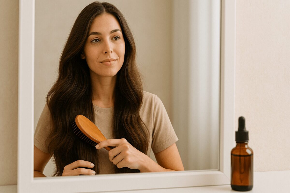 - Nanesite na čisto vlasište: Nakon pranja kose blagim šamponom, kosu nežno prosušite peškirom. Nanesite 5–10 kapi direktno na kožu glave u predelu gde želite da delujete – obično po razdeljcima kose ili na mesta gde je proređena kosa.