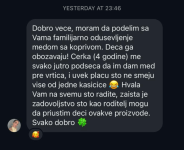Jako smo zadovoljni medom. Pored toga što je ukusan, veoma nam prija, imamo više energije. Preporučujemo ga prijateljima, i uzimaćemo ga i nadalje. Sve najbolje vam želim u daljem radu, kao i da održite nivo kvaliteta proizvoda i odnos prema kupcima.