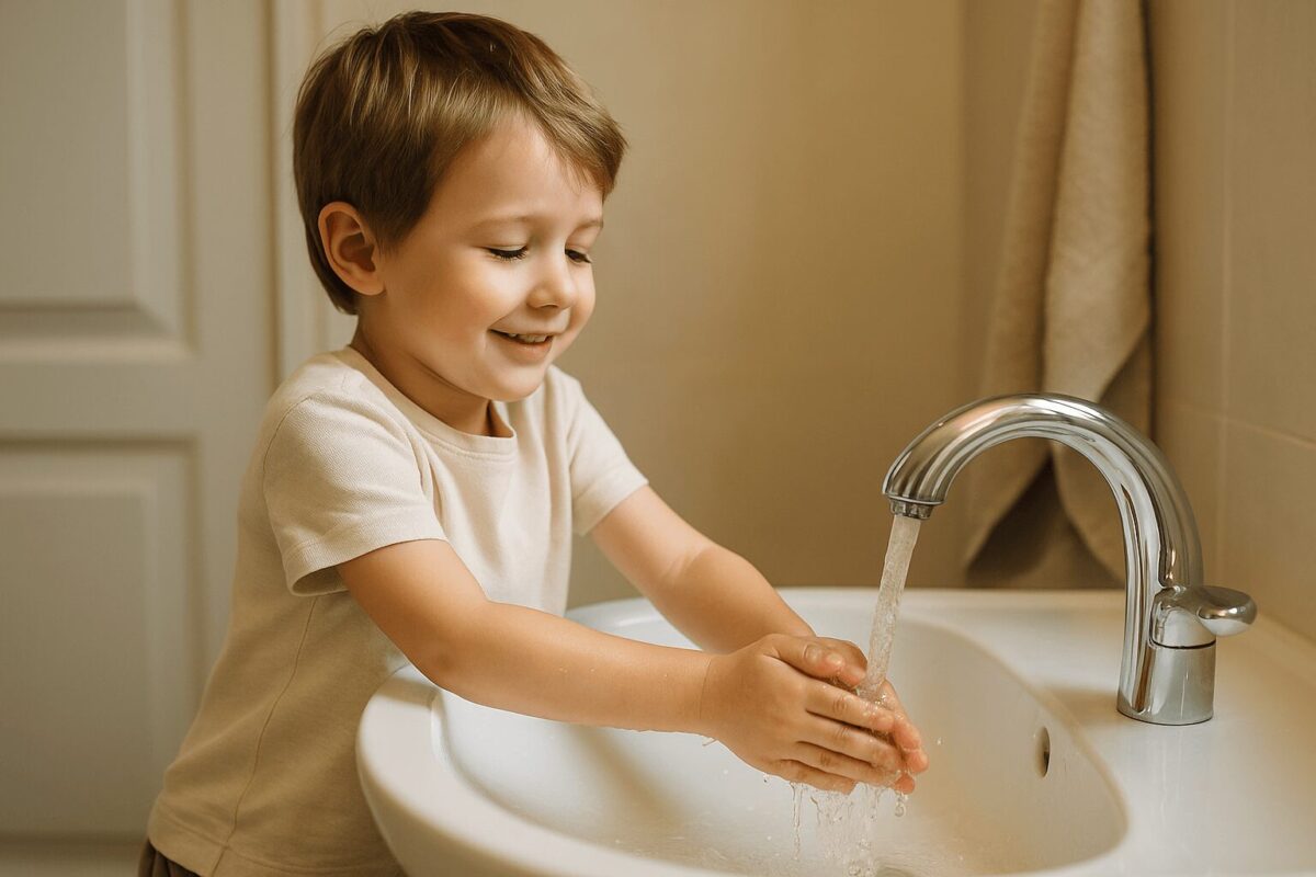 - Higijena ruku: Naučite dete važnosti pranja ruku sapunom i vodom, posebno pre jela, posle toaleta i po dolasku iz vrtića/škole. Čiste ruke su najbolja prevencija mnogih bolesti, jer se virusi često prenose preko dodira. Pravilno pranje traje oko 20 sekundi – pretvorite to u igru pevanjem kratke pesmice dok se ručice peru. Takođe, podsetite dete da ne trlja oči i ne stavlja prste u usta tokom igre.