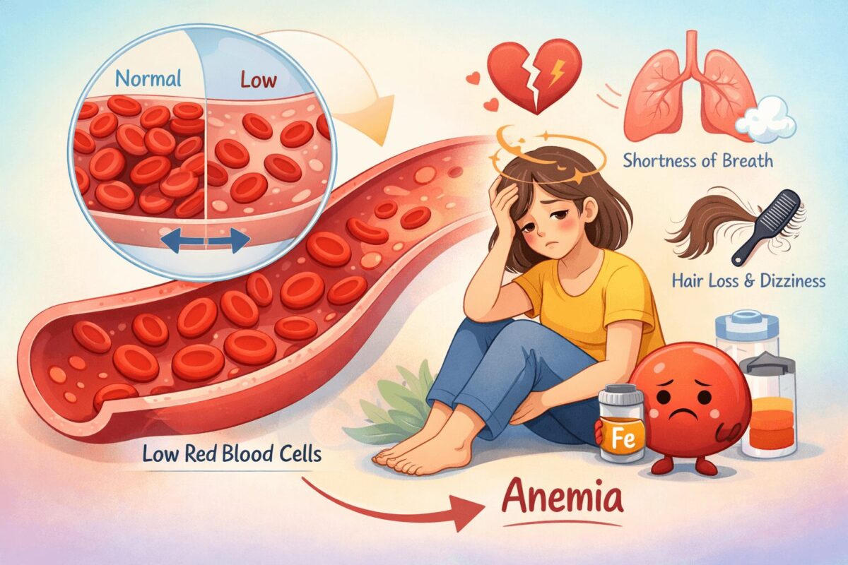Nizak broj eritrocita (anemija) dovodi do nedovoljne opskrbe tkiva kiseonikom, što izaziva brojne simptome koji se mogu postepeno razvijati: